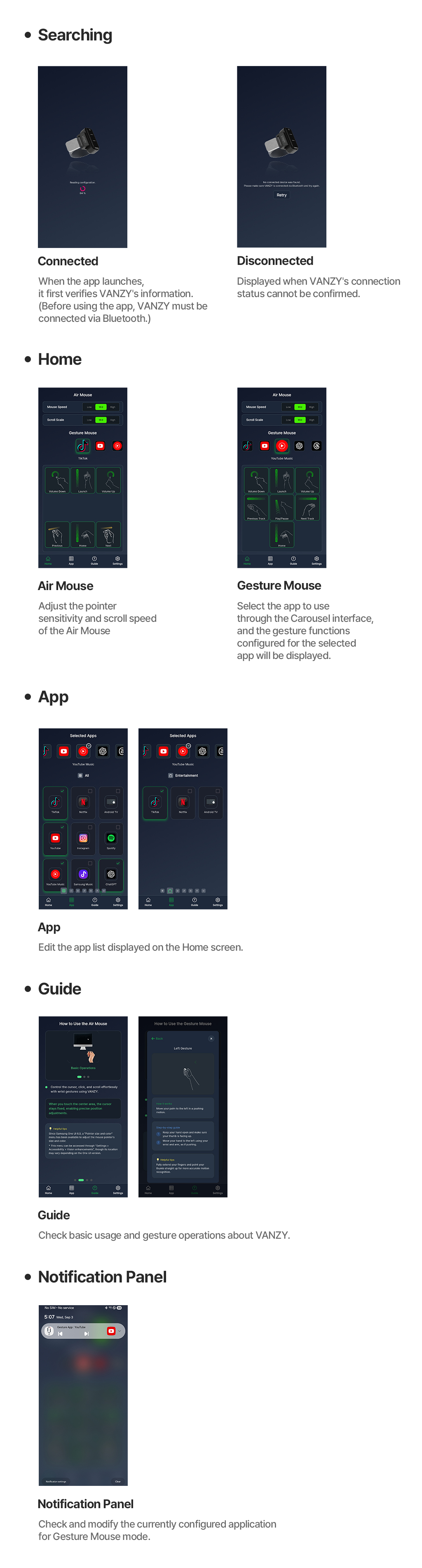 Each app has customized gesture functions, meaning the available gestures and their actions vary by app. When you switch apps, the gesture settings automatically change to match that app.